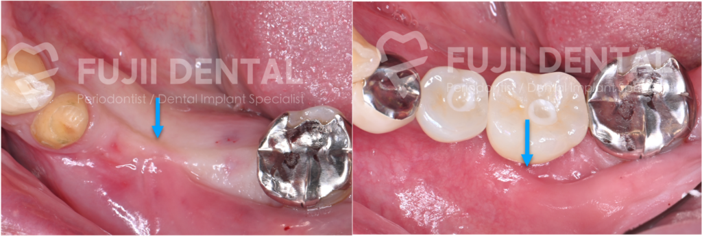 (右) 頬の帯状の粘膜が、インプラントを設置する部分に入り込んでいます。