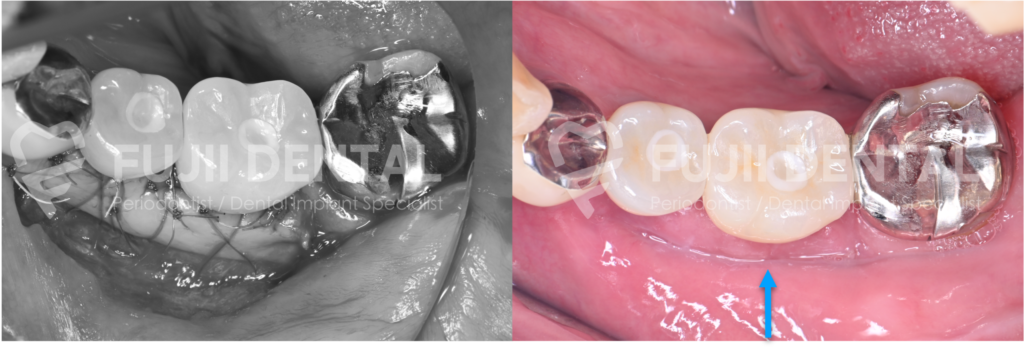この患者様は、もともと角化歯肉が少ない歯を抜歯した方です。骨造成を行ったうえでインプラントを埋入する際に、同時に角化歯肉の移植も実施しました。